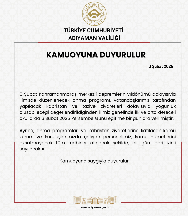 Valilikten yapılan açıklamada, "Yoğunluk oluşabileceği değerlendirildiğinden Adıyaman genelinde ilk ve orta dereceli okullarda 6 Şubat Perşembe günü eğitime bir gün ara verilmiştir. Ayrıca anma programları ve kabristan ziyaretlerine katılacak kamu kurum ve kuruluşlarımızda çalışan personelimiz, kamu hizmetlerini aksatmayacak tüm tedbirler alınacak şekilde bir gün idari izinli sayılacaktır" denildi.