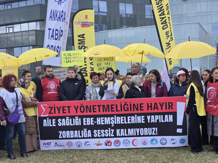 Birlik ve Dayanışma Sendikası 3 No'lu Şube Disiplin Kurulu Üyesi Hemşire Canan Şahin, Ankara İl Sağlık Müdürlüğü önünde yaptığı ortak açıklamada, Sağlık Bakanlığı’nın, 1 Kasım’da yürürlüğe giren Aile Hekimliği Sözleşme ve Ödeme Yönetmeliği'ne 'hayır' dedi.