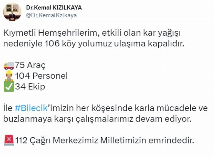 İl Özel İdaresi ekipleri kapanan köy yollarını açmak için çalışmalara başlarken Bilecik Valisi Dr. Kemal Kızılkaya da, sosyal medya hesabından yaptığı paylaşımla, 75 araçtan oluşan 34 ekip ve 104 personelle "Bilecik'in her köşesinde karla mücadelemiz ve buzlanmaya karşı çalışmalarımız devam ediyor” dedi.