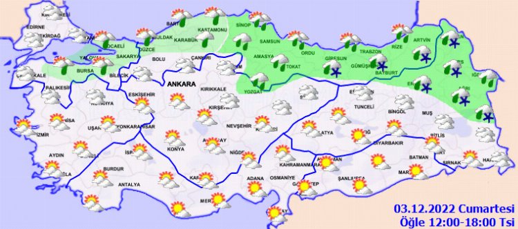 ANKARA (İGFA) - Meteoroloji Genel Müdürlüğü tarafından yapılan son değerlendirmelere göre: Ülke genelinin parçalı ve çok bulutlu, güneydoğu kesimlerinin az bulutlu, Marmara'nın doğusu, (Çorum hariç) Karadeniz, Doğu Anadolu’nun kuzeydoğusu ile Yozgat ve Van çevrelerinin yağışlı geçeceği tahmin ediliyor. Yağışların, genellikle yağmur ve sağanak, Doğu Karadeniz’in iç kesimleri ile Doğu Anadolu’nun kuzeydoğusunda karla karışık yağmur ve yer yer kar yağışlı geçeceği tahmin ediliyor. Sabah ve gece saatlerinde iç kesimlerde pus ve yer yer sis bekleniyor.