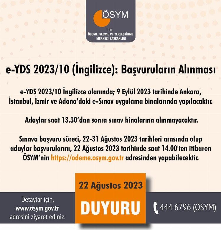 ÖSYM'den yapılan açıklamaya göre, e-YDS 2023/10 İngilizce, 9 Eylül'de Ankara, İstanbul, İzmir ve Adana'daki e-Sınav uygulama binalarında düzenlenecek.