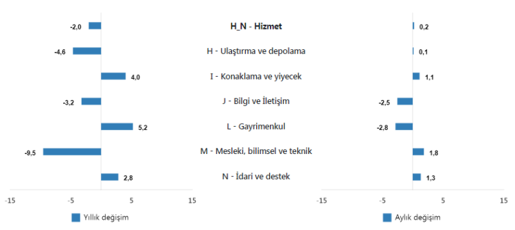 TÜİK, Ekim ayına ilişkin hizmet üretim endeksi verilerini açıkladı. Ulaştırma ve depolama hizmetleri yüzde 4,6 azaldı, konaklama ve yiyecek hizmetleri yüzde 4,0 arttı, bilgi ve iletişim hizmetleri yüzde 3,2 azaldı, gayrimenkul hizmetleri yüzde 5,2 arttı, mesleki, bilimsel ve teknik hizmetler yüzde 9,5 azaldı, idari ve destek hizmetleri ise yüzde 2,8 arttı.
