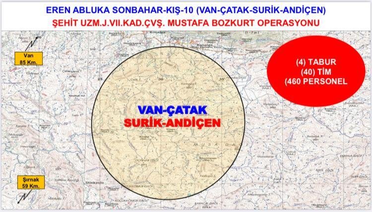 ANKARA (İGFA) - PKK terör örgütünü ülke gündeminden çıkarmak ve bölgede barındığı değerlendirilen teröristleri etkisiz hale getirmek maksadıyla, Van İlinde “Eren Abluka Sonbahar-Kış-10 (Van- Çatak-Surik-Andiçen) Şehit Uzm.J.VII.Kad.Çvş. Mustafa BOZKURT” Operasyonu başlatıldı.