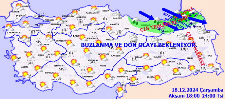 ÇIĞ TEHLİKESİ UYARISI: Meteoroloji Genel Müdürlüğü’nden yapılan son değerlendirmelere göre, Türkiye genelinde kuzey, iç ve doğu bölgelerde parçalı ve çok bulutlu hava etkili olacak. Özellikle Doğu Karadeniz kıyıları, Bartın, Sinop, Ordu ve Ardahan çevrelerinde kuvvetli yağmur ve sağanak bekleniyor. Rize, Artvin ve Ardahan'ın iç kesimlerinde ise yoğun kar yağışı etkili olacak.