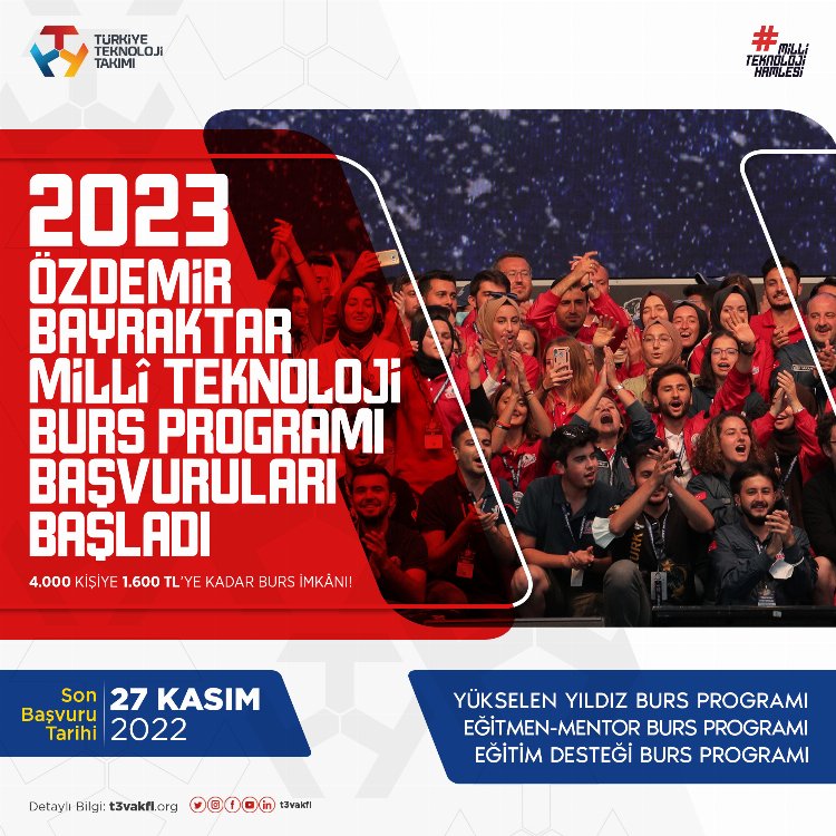 Yetenekli gençlerin teknoloji geliştirme süreçlerine katılmasını sağlayan T3 Vakfı, öğrencilerin proje ve faaliyetlerini desteklediği Özdemir Bayraktar Milli Teknoloji Burs Programı ile 4 bin öğrencinin gelişimine katkı sağlarken ayrıca TEKNOFEST’te gönüllü olarak görev alma, kamplar, geziler, özel eğitimlere katılma ve T3 Vakfı’nın çalışmalarında yer alma gibi pek çok özel fırsatlar da sunuyor.