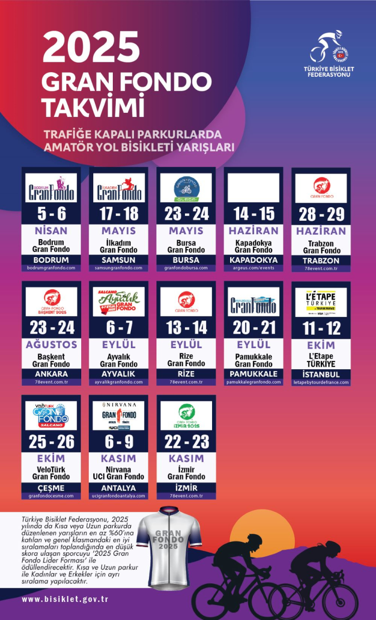 Türkiye Bisiklet Federasyonu amatör bisiklet sporunu yaygınlaştırma hedefi doğrultusunda dev organizasyonları 2025 yılı takvimde bir araya getirdi. 2025 yılı içerisinde 12 farklı ilde toplamda 13 Gran Fondo yarışı düzenlenecek.